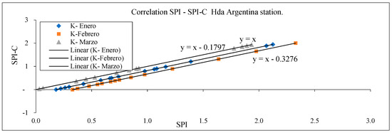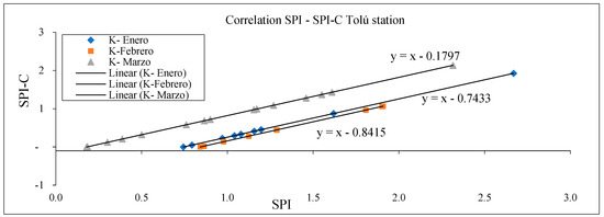 To check the validity of the correction, the correlation between the SPI and the SPI-C, for the month of January, February and March was determined through Pearson’s linear determination coefficient, this is a measure of linear dependence between two quantitative random variables; this means that the mathematical model used to approximate the relationship between the variable (SPI-C) and the independent variable (SPI) reflects a high correlation. Figure 18 and Figure 19 and Table 3 show the correlation between SPI and SPI-C.