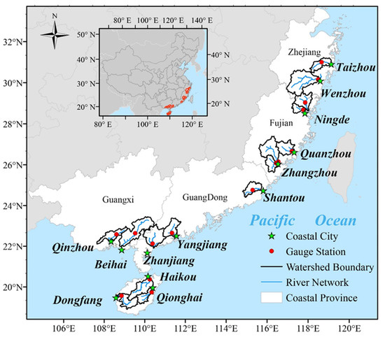 This study selected fifteen coastal-estuarine regions in the coastal southeastern China, including the coastal area of the Chinese mainland and Hainan Island of southeastern China (Figure 1) (defined as the region within 106° E to 120° E and 18° N to 32° N; referenced to the World Geodetic System 1984, WGS84). The selected coastal-estuarine regions satisfy the condition that the ratio of the tropical-cyclone-induced rainfall to the total rainfall in the catchment that drains freshwater into ocean is greater than 10%, according to the analysis of spatiotemporal variation in typhoon rainfall over South China [46]. Figure 1 shows the locations of catchments that drains freshwater into ocean and coastal cities in the selected coastal-estuarine regions. The fifteen coastal-estuarine regions are located in subtropical monsoon climate zone. Floods in these coastal-estuarine regions mainly occur from May to September. In the flood season, heavy rainstorms are the major cause of floods in this region, and they are dominated by two distinct systems: East Asian monsoon and tropical cyclone in North Pacific Ocean.