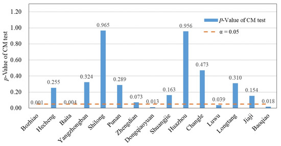 We used independent joint distribution to fit the bivariate probability distribution and applied CM test to test the joint distribution in all coastal-estuarine regions. The results were shown in Figure 2. The critical 5% level is indicated by a dashed line, the p-values of CM test is smaller than the critical level means that the independent joint distribution cannot describe the dependence structure of river discharge and sea level. It can be seen that in 10 coastal-estuarine regions, where river discharge and sea level were independent, the independent joint distribution passed the CM test. However, in the remaining 5 coastal-estuarine regions, where the two variables were correlated, the independent joint distribution cannot fit with the data. This demonstrates the necessary of using copula functions to describe the dependence structure of river discharge and sea level in those 5 coastal-estuarine regions.