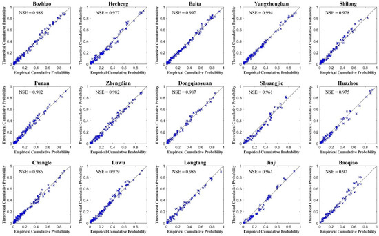 - Univariate analysis: McVAT was used to select the “best” marginal univariate distributions and , respectively. McVAT employs 17 different continuous marginal distribution functions (Beta, Birnbaum-Saunders, Exponential, Extreme value, Gamma, Generalized extreme value, Generalized Pareto, Inverse Gaussian, Logistic, Log-logistic, Lognormal, Nakagami, Normal, Rayleigh, Rician, T location-scale and Weibull) as candidate marginal distributions. The distribution functions are given in Table S1. The parameters of all candidate marginal distributions were estimated through a maximum likelihood algorithm based on observed time series of one variable. Kolmogorov–Smirnov goodness-of-fit test [57] was then employed to statistically examine the hypothesis that data was sampled from the fitted distribution at 5% significance level. The “best” marginal univariate distribution was picked out from non-rejected candidate marginal distributions based on the Akaike information criterion (AIC) [58]. Nash–Sutcliffe efficiency (NSE) between theoretical and empirical probabilities [56] was applied to evaluate the performance of fitted marginal univariate distribution.