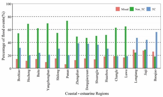 Percentage of mixed, non-TC-induced and TC-induced flood events in coastal-estuarine regions.