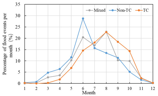 Percentage of mixed, non-TC-induced and TC-induced flood events per month in coastal-estuarine regions.