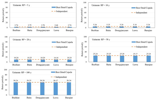 The bivariate probability distributions were built based on the best fitted copula function in 5 coastal-estuarine regions (Bozhiao, Baita, Dongqiaoyuan, Luwu and Baoqiao) where the river discharge and sea level were correlated. Then, the bivariate return periods and bivariate design values were calculated based on constructed bivariate probability distributions. For the sake of comparison, the bivariate return periods and bivariate design values were also calculated based on independent joint distribution in 5 coastal-estuarine regions. Assuming that the univariate return period for the two variables was the same, the bivariate return periods were calculated by Equation (4) when the univariate return period equals to 5, 10, 20, 50 and 100 years, respectively. The results were shown in Figure 7. The dash line represents the return periods calculated by independent joint distribution and the bar represents the return periods calculated by the best fitted copula function. It can be seen that the bivariate return periods calculated by copula and independent joint distribution had little difference. This indicates that compounding impacts of river discharge and sea level may inappropriately characterize the coastal flood risk, but had limited impact on bivariate return periods.