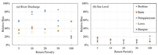 Relative bias of design values of (a) River discharge and (b) Sea level calculated by copula function and independent joint distribution.