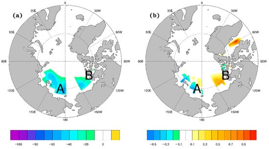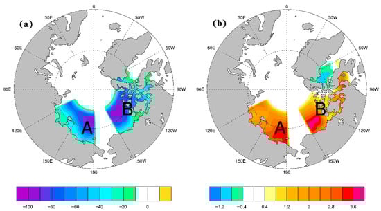The sea ice concentration differences ((a), unit: %) and the differences of SST ((b), unit: °C) in the Arctic at the key areas when joined in the model climate condition (the differences are 2090c minus CTL).