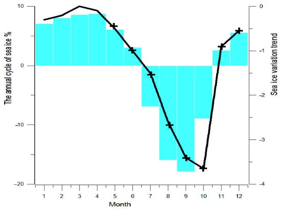 The bars for the annual cycle (1979–2019) of anomaly (%) to Arctic sea ice concentration. The line stands for the monthly sea ice concentration rate changing trends (1979–2019). The cross signifies the months that have passed the 0.05 significance level test.