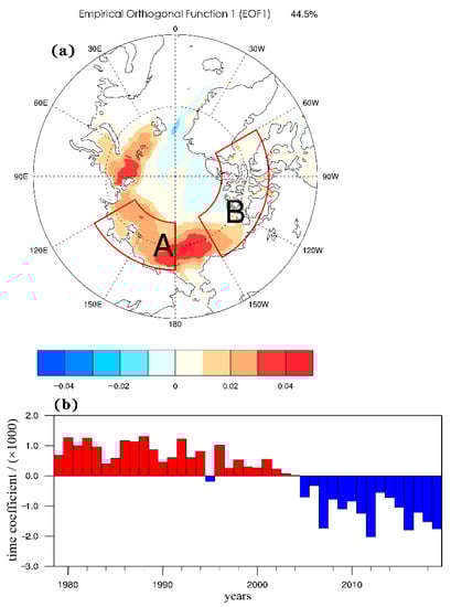 The first mode spatial distribution (a) and time index (b) of EOF analysis on Arctic sea ice from August to October in 1979 to 2019.