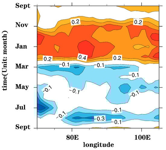 The differences of the 70°–110° E average meridional circulation and temperature between 2010c and CTL are shown in Figure 10a, with the comparison of CTL and 2010c. As the northerly flow on the north side of the plateau strengthens, the temperature differences from the Arctic to plateau below 300 hPa are abnormally negative. The Arctic temperature will not increase significantly as sea ice decreases at all. However, the actual sea ice reduction in August to October causes a significant increase in the Arctic temperature from November to the following February. The comparison between CTL and 2090c (Figure 10b) shows a positive temperature anomaly from the lower level in the Arctic from November to the following February. At the same time, there is a strong negative temperature anomaly in the middle–high latitudes to the north of the TP, which becomes a more substantial cold source. This leads to intensification of the meridional wind, and thus the northerly airflow over the TP strengthens.