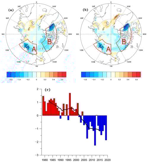 The correlation between the time coefficient of the first mode shown by the EOF decomposition of the number of cold days and cold nights over the TP in November to the following February and the Arctic sea ice concentration during August to October was analyzed (Figure 6a,b). The sea ice concentration index of the key areas is selected: A: eastern Laptev Sea–East Siberian Sea (120° E~180° E, 70° N~80° N) and B: Beaufort Sea–Baffin Bay (150° W~60° W, 70° N~80° N), on the basis of the location of the significant area of the correlation coefficient. We find a negative correlation between the Arctic sea ice concentration with cold days and cold nights. It indicates that there will be more cold days over the TP, with less sea ice in the key areas. The Arctic sea ice concentration in the key areas from August to October is standardized (Figure 6c), reflecting the interdecadal variation of the Arctic sea ice concentration from August to October. After the middle-1990s, the ratio in the key areas of the Arctic begins to decrease from August to October. Since the beginning of the 21st century, the decreasing trend has accelerated, consistent with the increasing number of low-temperature days over the TP.