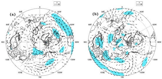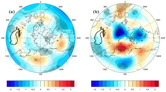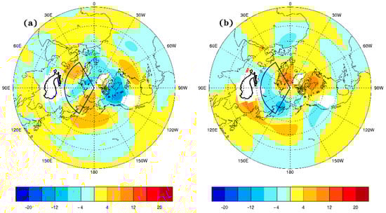 The results of the sensitivity experiment and control experiment are analyzed. The differences of the 500 hPa geopotential height field between 2010c and CTL (Figure 8a) indicate that the geopotential height in Aleutian and North Atlantic increases is larger when the prescribed sea ice concentration decreases and SST increases. It means the Aleutian low and westerly jet at 500 hPa both weaken. In the west of Eurasia and the south of TP, the geopotential height at 500 hPa also weakens significantly. The “wave–like” pattern will occur in the areas from the North Atlantic Ocean to the south of the TP, and the meridional wind strengthens, causing the cold air in the north to spread southward. The differences between the 2090c and CTL (Figure 8b) show that, as the forcing strengthens, the 500 hPa geopotential height at the pole and TP weaken, and the geopotential heights strengthen in the northern part of Eurasia.