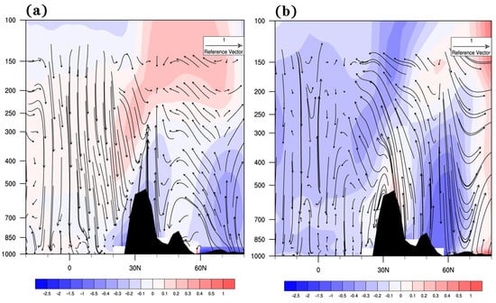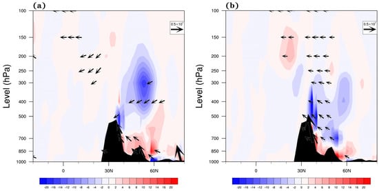 The differences of 70°–110° E average latitude circulation (unit: m s−1) and temperature (shading, unit: °C) ((a): 2010c minus CTL. (b): 2090c minus CTL, the black shading is terrain).