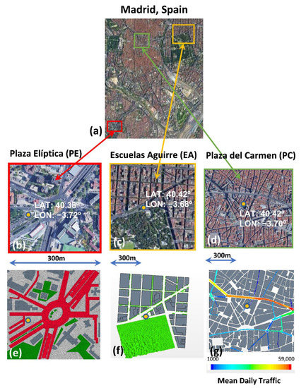 Three neighborhoods of Madrid, Spain, are selected around three of the Air Quality Monitoring Stations (AQMSs) that usually record the highest concentration levels within the city. These AQMSs are: Plaza Elíptica (PE), Escuelas Aguirre (EA), and Plaza del Carmen (PC) (Figure 1a) and belong to the AQMS network of the Madrid city council. The annual average of NO2 concentration recorded at these AQMSs were above 40 µg m−3, which is the annual average limit value for EU legislation (56 µg m−3 for PE, 57 µg m−3 for EA and 46 µg m−3 for PC) [32].