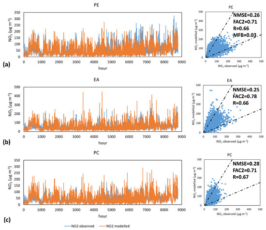 Firstly, the modelling approach using CFD simulations is evaluated for 2016. For this purpose, the time series of NO2 concentrations recorded at the three AQMSs are compared with modelled NO2 concentrations. It is noteworthy that previous evaluations of spatial distributions of NO2 concentrations computed with a similar methodology were carried out for the same numerical domains. The authors of [15] estimated the spatial distribution of time-averaged NO2 concentrations over approximately three weeks in two different time periods (January–February 2011 and November 2014) for the EA numerical domain. The time-averaged NO2 concentrations were successfully compared with data from two experimental campaigns deploying 26 and 95 passive samplers in 2011 and 2014, respectively. The authors of [38] estimated the spatial distribution of time-averaged NO2 concentrations over approximately three weeks in February 2015 for the PE numerical domain. The modelling approach showed a good agreement with the time-averaged NO2 concentrations recorded by 72 passive samplers distributed throughout the study area. Unlike previous studies, where background concentrations were derived from the closest urban background AQMS, the present work obtains background NO2 concentrations from air quality mesoscale simulations. In fact, background concentrations of emission reduction scenarios can only be derived from mesoscale simulations.