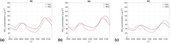 Mean diurnal variation of observed (black) and modelled (red) NO2 for the year 2016 at (a) PE AQMS, (b) EA AQMS, and (c) PC AQMS for the year 2016.