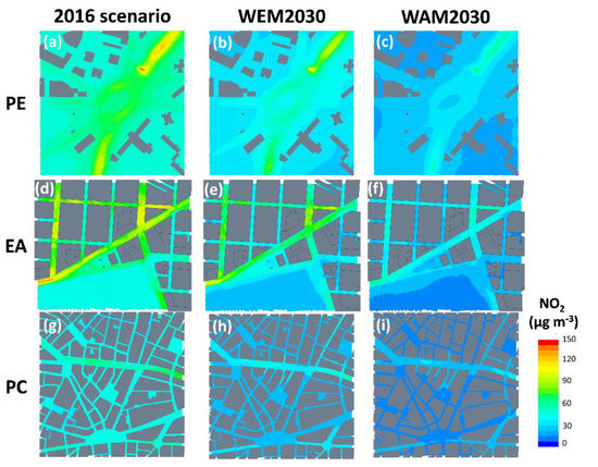 Maps of annual average NO2 for the 2016 scenario (a,d,g), WEM2030 scenario (b,e,h) and WAM2030 scenario (c,f,i) in the PE study area (a–c), EA study area (d–f), and PC study area (g–i).
