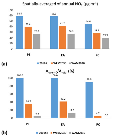 This is in agreement with [2], who used mesoscale simulations for the Iberian Peninsula, that, of the three air quality zones (areas designated under European legislation for managing air quality) that exceeded the annual mean limit value for NO2 for the 2016 scenario, two air quality zones exceeded the limit value for the WEM scenario and none for the WAM scenario. However, as shown by [4], to estimate population exposure and air quality assessment, it is important to take into account the spatial variability of NO2 concentrations within each neighborhood. Despite the annual mean limit value not being exceeded in any of the study neighborhoods in terms of the spatially-averaged NO2 concentrations for the WAM2030 scenario, there are areas with concentrations above 40 µg m−3 within two neighborhoods (4% for PE and 12% for EA). This indicates that if the population was homogenously distributed over the area, 4% of the people in the PE study area and 12% of the people in the EA study would be exposed to a concentration above the limit value. For the WEM2030 scenario, these percentages are larger with values of 35%, 41%, and 5% for the PE, EA, and PC study areas, respectively. All of these percentage depends on the dimensions of the study areas and this issue is important to bear in mind for the interpretation of the results. However, the spatially-averaged concentrations over the microscale domains are similar to the values provided for mesoscale models where the spatial resolution is similar to the size of the numerical domains. Therefore, this study shows that the annual mean limit could be exceeded in some areas within the mesoscale cells in spite of the spatially-averaged NO2 concentration being below the limit value. This issue highlights the importance of studying air quality at the street level. In future studies, the movements of people within the study areas could be considered to estimate the personal exposure. The authors of [3] used CFD simulations and microsimulations of pedestrian movements to estimate the pedestrian exposure. Combining the methodology used in the present study and similar computations of pedestrian movements, future studies could estimate the impact of strategies to improve air quality in terms of personal exposure.