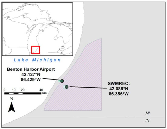 Map of the study area in southwest Michigan. Included are two points where (1) long-term weather historical weather data was obtained (Benton Harbor Airport, 42.127°N, 86.429°W) and (2) the location where model data was extracted for this study (SWMREC, 42.088°N, 86.356°W).