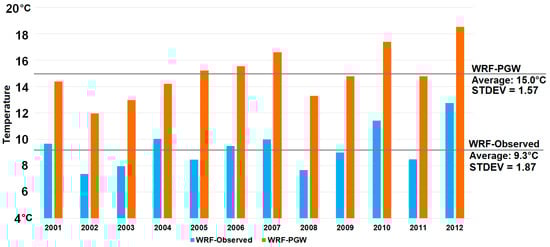 Average temperatures (in °C) from 2001 to 2012 for the MAM months for the WRF-observed and WRF–PGW model runs. The WRF-observed temperatures had an all-time mean average error of 0.38 °C with real world observations and thus are considered to be an accurate representation of actual temperatures.