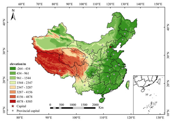 Meteorological data (wind field, temperature and precipitation) were collected from “China Monthly Surface Climate Data Set” (http://data.cma.cn/data/cdcindex/cid/6d1b5efbdcbf9a58.html), with a total of 15 years and 613 meteorological stations. The GDP (gross domestic product) kilometer grid dataset and land use and cover data were acquired from a resource and environment data cloud platform of the Chinese Academy of Sciences (https://www.resdc.cn/DOI/DOI.aspx?DOIid=54). The GDP spatial distribution map was based on county-level statistical data closely related to anthropogenic economic activities, using multi-factor weight analysis [31,32]. In addition, the land use and cover map were obtained by manual visual interpretation based on Landsat TM/ETM remote sensing images. In addition, NDVI (normalized difference vegetation index) data were derived from MOD13Q1 products, and available from the MODIS satellite (https://lpdaac.usgs.gov/products/mod13q1v006/).