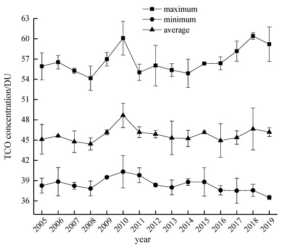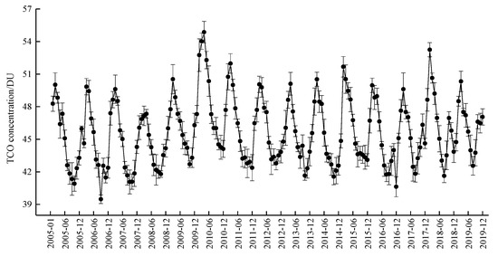 It can be seen from Figure 7 that the monthly variations of TCO concentration displayed a cyclical trend during 2005–2019. The TCO concentration was at a low value from June to November, and the lowest TCO concentration occurred in September 2006 (39.48 DU). By contrast, high TCO concentration appeared from December to May, and the highest value was in April 2010 (54.87 DU). The pattern of TCO concentration might be related to emission ozone precursors such as alkanes and olefins, which are prone to photochemical reactions under high temperature and intense radiation in spring [2].