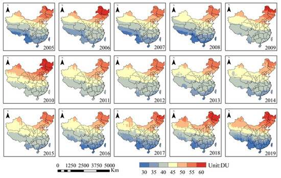 This study analyzed the annual, seasonal and monthly spatiotemporal distribution of TCO concentration over China from 2005 to 2019. We only discussed TCO in the continent. In order to more clearly reflect the distribution of TCO over China, TCO concentrations were divided into seven levels according to the natural break point classification method: first level (30–35), second level (35–40), third level (40–45), fourth level (45–50), fifth level (50–55), sixth level (55–60), seventh level (>60). Different colors represent different levels, and the unit used was the Dobson unit (DU).