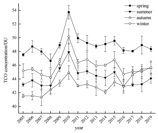 The seasonal variations of TCO concentration maintained the pattern of spring > winter > summer > autumn in the past 15 years (Figure 5). This is due to the photochemical reaction caused by the increase in solar radiation, which increased the concentration of TCO [41]. The maximum TCO concentrations in spring, winter, summer, and autumn were 35.82 DU, 33.45 DU, 31.93 DU, and 29.96 DU, respectively. However, the trend changed from 2016 onwards. The concentration of TCO increased significantly in autumn, which was mainly due to the increase in TCO concentration caused by stratospheric ozone input due to climate change in the autumn of 2016.