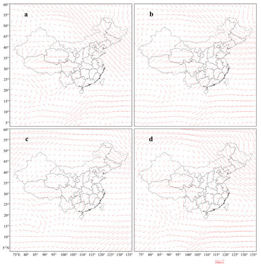 The wind field map of four seasons from China in 2019 ((a): spring; (b): summer; (c): autumn; (d): winter).