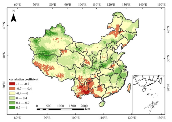 Vegetation can change the stability of the carbon cycle and climate system, which plays a role in energy flow and the material cycle in the ecosystem [45]. Figure 11 shows the correlation between annual TCO concentration and vegetation coverage from 2005 to 2019, of which 42.10% was negatively correlated and 57.9% was positively correlated. Isoprene, as the largest volatile organic compound emitted by plants, had a significant contribution to the production of ozone [46]. EC is close to the sea, rich in water vapor, and diverse in vegetation, which mainly consists of distributed deciduous broad-leaved forests and evergreen broad-leaved forests. Large amounts of VOCs released by plants provide precursors for photochemical reactions and then are transported to cities with the wind, which leads to higher TCO concentrations. Comparatively, the Gobi and desert areas in NW are influenced by arid climate, sparse vegetation, and low isoprene emission, so correlation coefficient was lower.