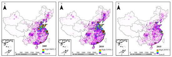 Spatial distribution map of GDP in 2005, 2010, and 2015.