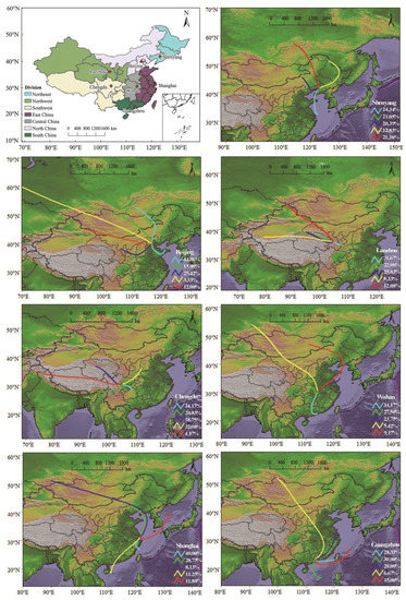 The HYSPLIT model was researched and developed jointly by the National Oceanic and Atmospheric Center and the Australian Meteorological Agency. This model can be used to calculate and analyze airflow movement, mass sedimentation, pollutant transport pathways and diffusion trajectories [35,36,37]. TrajStat software was implemented to identify potential path sources from the long-term measurements of air pollutants [38]. We used TrajStat software to analyze the backward trajectory of TCO. Shenyang (41°48′ N, 123°25′ E), Beijing (39°56′ N, 116°20′ E), Lanzhou (36°03′ N, 103°73′ E), Chengdu (30°67′ N, 104°07′ E), Wuhan (30°52′ N, 114°31′ E), Shanghai (31°23′ N, 121°47′ E) and Guangzhou (23°16′N, 113°23′E) were set as the simulated receiving points. The daily monitoring time was implemented at 00:00, 6:00, 12:00 and 18:00 (Beijing time) from 2019.