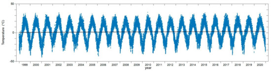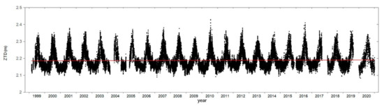 The GAMIT software package is used to process the primary GPS data [17]. This is a universal data processing tool for accurate positioning of the observation point and the speed of its geodynamics [1]. As a result of data processing, the GAMIT program simultaneously generates ionospheric and tropospheric signal delays. The total zenith tropospheric delay and its horizontal gradients are extracted as separate files in a universal format. Figure 1 shows the measured ZTD time series at the IRKM observation point from 1999 to 2020. The ZTD measurement is performed with an accuracy that is no worse than ±0.0045 m or 0.2%. During the observation period, the GPS receiver and antenna were updated only once, on 22 January 2014. However, this update did not affect the measurement results. In 2004 and 2005, there are missing measurements for technical reasons. In the periods from 8 November to 31 December in 2017 and 2019, the processing of primary GPS data for all three observation points was not performed, also for technical reasons. The red line shows a slight positive linear trend in the ZTD.