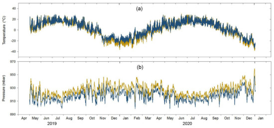 Comparison of changes in temperature (a) and atmospheric pressure (b) from 1 May 2019 to 31 December 2020 at the BADG observation point (blue graphs) and at the Kyren weather station (yellow graphs) located at a distance of 11 km from the BADG.