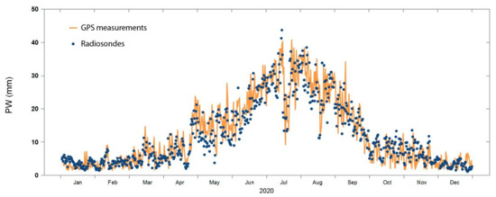 Radiosonde launches are one of the main operational sources of observations of meteorological parameters at different altitude levels, including air humidity. Moisture data from radiosondes are retrieved from the University of Wyoming website. Water vapor levels are provided in the form of precipitable water. They can be used to independently verify the resulting ZTD data from GPS measurements. In most cases, the points of GPS observations and radiosonde launches do not coincide, but for the purposes of comparing the obtained data, a distance of up to 50 km is quite acceptable [19]. The aerological station Angarsk is located at a distance of about 42 km from the station of permanent GPS measurements IRKM. The difference in the height of the location above sea level of both observation points does not exceed 60 m. Figure 3 shows the time series of the moisture content of the low atmosphere, according to GPS measurements and radiosonde launches for 2020. The cross-correlation coefficient between the given data is equal to 0.82, the average deviation was 3.1 mm, and the standard deviation (RMS) of the data difference is equal to 7.5 mm. The RMS in summer is about 16% of the average summer value of the total water vapor for Irkutsk. This is significantly higher than the specified measurement error of the humidity sensors of the radiosondes, which is 5%. The most likely reason for this seasonally dependent variation in values is the spatial variability of moisture fields. The variability of the data obtained from GPS measurements is greater than that of radiosondes. This means that GPS measurements are more sensitive to tropospheric inhomogeneities, and this can be used to refine data on troposphere moisture content fields.
