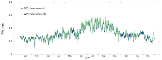 Figure 4 shows comparative graphs of the levels of total moisture content obtained from GPS observations and WVR measurements at BADG during 2020. On some days, WVR measurements were not performed; the longest intervals data gaps are observed from 20 to 29 May, from 1 to 15 October, and from 21 to 28 October. The IWV values were calculated from the measured GPS tropospheric delay data using Equation (4). Figure 5a shows a comparison of the PW values obtained from GPS and WVR measurements during 2020. The solid line shows the linear regression of the given data. The cross-correlation coefficient between the given data is equal to 0.92. The mean deviation and standard deviation of the difference in the presented data throughout the year are 0.12 mm and 1.6 mm, respectively. The standard deviation is equal to 0.9 mm in winter, and 2.2 mm in summer. Separately considering the daytime (14 LT) and nighttime (02 LT) PW data during the year, the mean deviation and standard deviation of the difference are 0.15 mm and 1.81 mm in the daytime, 0.08 mm and 1.38 mm in the nighttime. At night, when the level of moisture content in the lower part of the atmosphere noticeably decreases, the accuracy of the PW measurement increases.