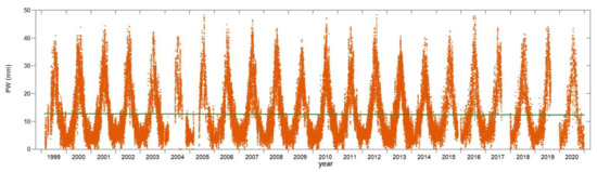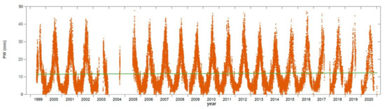 Time series of measured PW values at the ULAZ for the period 1999–2020. The green line is the general linear trend.
