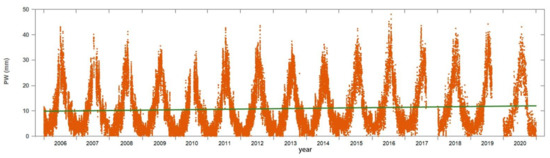 Time series of measured PW values at the BADG for the period 2006–2020. The green line is the general linear trend.