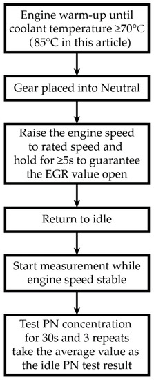To reduce the apparatus expense of possible future PN fast testing, the detection range of this low-cost CPC was designed to be about two orders of magnitude smaller than a PEMS CPC but was still deemed competent for DPF failure identification because the fast identification procedure only contains idle PN testing [45,46]. The instrument was a retail version validated by its manufacturer; before the tests, the readings of the instrument and PEMS were compared at idle, which showed good agreement.