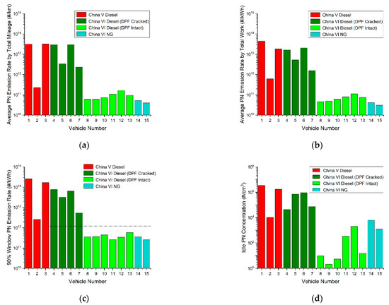 PN emission and idle PN concentration measured by PEMS test. (a) Average PN emission rate by total mileage; (b) Average PN emission rate by total work; (c) 90% window PN emission rate; (d) Average idle PN concentration.