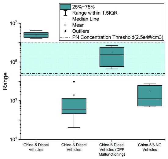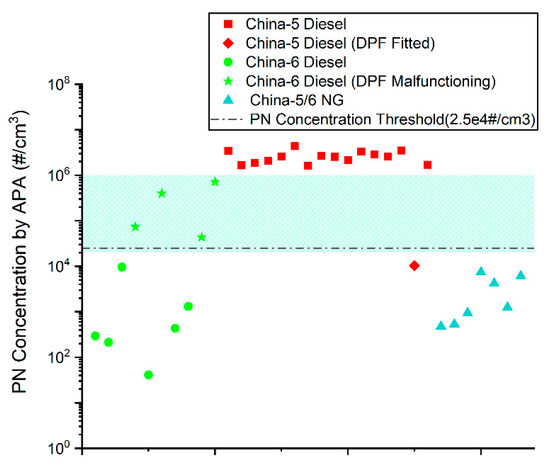 As shown in Figure 6, from 1 × 104 to 1 × 106#/cm3, there was a channel traversing between the upper range of proper China-6 diesel, which was also close to the upper range of China-5/6 NG, and the bottom line of China-5 diesel. The presence of such a channel creates a solid basis for the possible identification of non-major DPF damages with idle PN tests using low-cost CPC systems. It can be also noticed in Figure 5 that one proper China-6 diesel and the DPF-fitted China-5 diesel reported idle PN results around 1 × 104#/cm3, inferring the necessity of reserving a security margin when setting the PN threshold for suspected DPF failure. To balance the risk of misjudgment and the cost-benefit ratio of the method, it is recommended to set the PN threshold to no lower than 2.5 × 104#/cm3; a phase-in strategy could be considered.