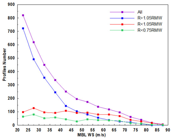 The profile number in each MBL mean wind speed group for different R/RMW ranges.