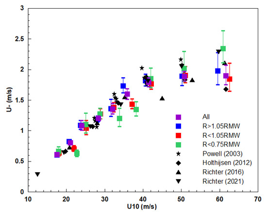 Variation of the friction velocity (, unit: m s−1) with 10-m wind speed (, unit: m s−1). The squares with 4 different colors represent the mean value in each wind speed bin from the 4 different R/RMW groups, and vertical bars represent the 95% confidence interval. Black symbols with different shapes represent the results from previous studies including Powell et al. [11], Holthuijsen et al. [16], Richter et al. [27], and Richter et al. [28].