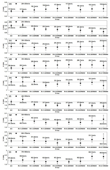 To further look into the – relationship under different R/RMW conditions, we plot the variation of with R/RMW in the range of >1.05, <1.05, and later on at 0.05 interval to <0.75 (Figure 4). When comparing the in the ranges of R/RMW > 1.05 and <0.95, a systematic decrease of with R/RMW is generally found for all MBL mean wind speed groups, except the 20–25 m s−1 and 35–40 m s−1 MBL mean wind speed groups. Richter et al. [28] showed by virtual dropsondes, that with a of about 65 m s−1 and R/RMW of about 0.85 (and of about 40 m s−1 and R/RMW of about 0.7), was underestimated by about 10~20% percent (Figure 10c,d in Richter et al. [28]). Here, although the real dropsondes do not repeat these values exactly, a reduction of by 5~25% from R/RMW > 1.05 to <0.95 is observed in the 7 out of 9 MBL mean wind speed groups.