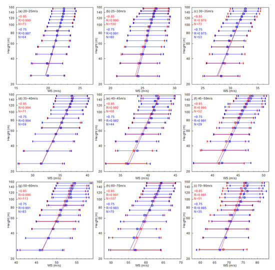 Wind profiles of R < 0.85RMW (in red) and R < 0.75RMW (in blue) in different MBL mean wind speed groups, (a) 20–25 m s−1, (b) 25–30 m s−1, (c) 30–35 m s−1, (d) 35–40 m s−1, (e) 40–45 m s−1, (f) 45–50 m s−1, (g) 50–60 m s−1, (h) 60–70 m s−1, and (i) 70–90 m s−1. The squares and horizontal bars represent the mean and standard deviation for each height bin. Lines from top to bottom represent the least square fitting within 20–160 m height. R is the regression coefficient. N is the number of dropsonde profiles.