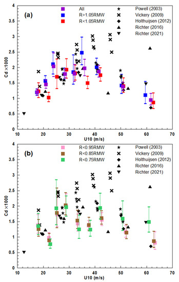 Same as Figure 3, but for the variation of the surface drag coefficient ( × 103) with 10-m wind speed (, unit: m s−1). (a) All, R/RMW > 1.05 and R/RMW < 1.05, (b) R/RMW < 0.95, R/RMW < 0.85 and R/RMW < 0.75. The various black symbols are the result from Powell et al. [11], Vickery et al. [30], Holthuijsen et al. [16], Richter et al. [27], and Richter et al. [28].