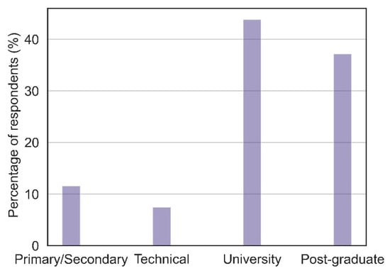 Finally, regarding education level (Figure 3), a notable percentage of 81% of respondents had received higher education, with 43.8% having a university degree and another 37.2% a master’s degree or higher. The rest of the respondents had completed a secondary or technical school. Thus, most tourists in our sample were highly educated.
