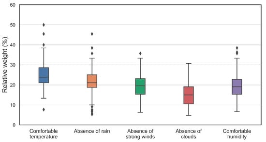 The boxplot in Figure 4 illustrates the distribution of weights for each climate variable resulting from the respondents’ answers. The distribution of urban tourists’ views is similar for the different climatic variables, albeit somewhat narrower for ambient temperature and absence of rainfall, indicating that tourists agree more on the latter variables. However, it is noted that these two climate variables also present the most outliers compared to the rest.