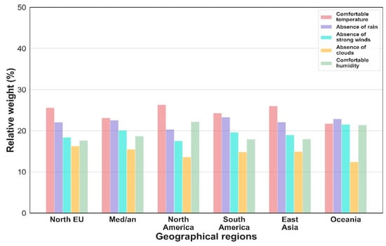 To investigate any patterns of climatic preferences with respect to tourist nationalities, the respondents were divided in six different geographical groups, namely Northern Europe, Mediterranean, North America, South America, East Asia, and Oceania. The weights of the different climatic variables per nationality group are presented in Table 4 and Figure 5.