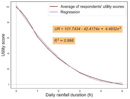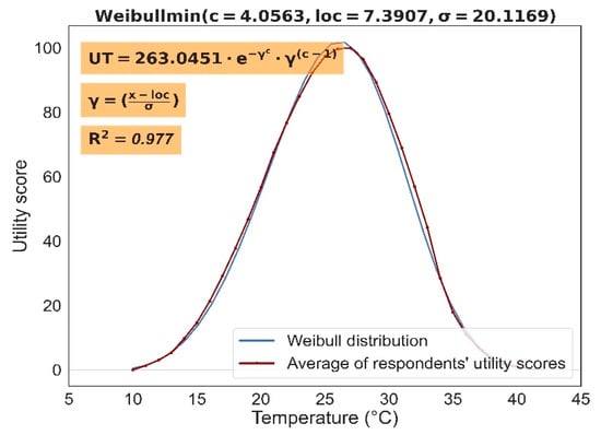 Once this process for all respondents is completed, each distinct level of a specific climate variable ends up with different utility scores (as many as the total number of respondents). Then, for each distinct value of each climate variable, these scores are averaged, resulting in a composite utility score for each value and, hence, to a composite utility distribution for this climate variable. This utility distribution can then be mathematically expressed by an empirical utility function. The aggregation of utility functions for all climate variables into an overall utility function (i.e., the UCCI index) is performed by using the weights of the different climatic variables, which are also estimated empirically through the answers of urban tourists to the relevant questions posed in the context of our survey. The following Section 3.2.1, Section 3.2.2, Section 3.2.3, Section 3.2.4 and Section 3.2.5 describe in detail the estimation of the utility function for each climatic variable, while the weights’ determination and the aggregation of the different utility functions into the UCCI index are presented in Section 3.3 and Section 3.4, respectively.