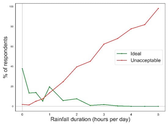 The participants are asked to rate their rainfall preference by indicating the ideal and ‘unacceptable’ rainfall duration (Sidealm, Sunacm) in minutes (or hours) per day during their vacations at the urban destination. Each respondent is presented with rainfall duration values ranging from 0 min to 5 h, with various interval steps. As before, a utility value of 100 is assigned to the ideal rainfall duration and a zero utility value to the unacceptable rainfall duration. Utility at all intermediate rainfall duration values is assumed to change in a linear way. Furthermore, it is assumed that any rainfall duration smaller than the stated ideal one corresponds also to a score of 100 (i.e., is also ideal) unless stated otherwise (notably, a few respondents replied that a 0 min rainfall is unacceptable for them), as in several research studies rainfall has been consistently found to reduce tourist satisfaction. Similarly, any rainfall duration higher than the stated unacceptable level is assumed to correspond to a zero utility score. The equations for calculating the utility scores for an intermediate rainfall duration Rn are given below