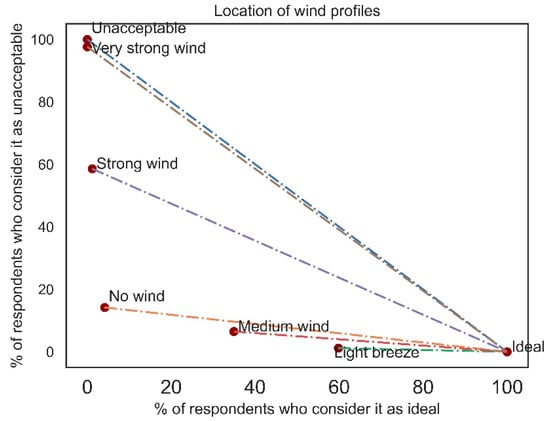 In the case of wind for urban tourism, the utility function is based on divergence of the views expressed []. In that sense, the ‘theoretically ideal’ wind profile would be the one that is evaluated as ideal by all respondents and by none of them as unacceptable. Likewise, the ‘theoretically unacceptable’ wind profile would be the one that is evaluated as unacceptable by all respondents and by none of them as ideal. In an x-y graph where the x-axis stands for the % of respondents who find a specific wind profile as ideal (In) and the y-axis stands for the % of respondents who consider it as unacceptable (Un), the distance dworst between the ‘theoretically unacceptable’ wind profile (i.e., the ‘worst’ profile) and the ‘theoretically ideal’ wind profile is
